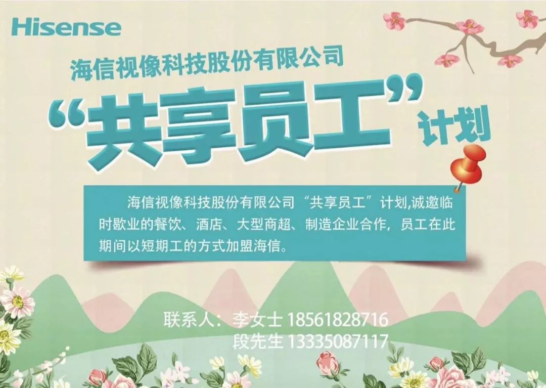 海信視像 : 2 月 11 日正式推出“共享員工”計劃,與餐飲、酒店、大型商超共同抗“疫”,邀請臨時歇業(yè)的企業(yè)員工以短期工的方式加盟公司,共同渡過非常時期。一周來,已經(jīng)共有 60 名“共享員工”到崗。