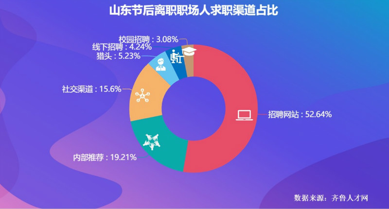 1月28日,山東省人力資源和社會(huì)保障廳制定下發(fā)《關(guān)于開(kāi)展2020春風(fēng)行動(dòng)暨就業(yè)援助月活動(dòng)的緊急通知》,確定停辦現(xiàn)場(chǎng)招聘活動(dòng)的,將線下活動(dòng)轉(zhuǎn)向線上,集中開(kāi)展互聯(lián)網(wǎng)招聘。借此我們也對(duì)山東節(jié)后離職職場(chǎng)人求職渠道進(jìn)行了統(tǒng)計(jì)。如上圖所示,招聘網(wǎng)站成為求職者求職最主要的渠道其占比高達(dá)52.64%;而類似線下招聘會(huì)、校園招聘、獵頭等面對(duì)面為主的求職渠道使用比例受疫情防控影響而顯著減少;內(nèi)部推薦和社交渠道占比也相對(duì)較高,分別為19.21%和15.6%。