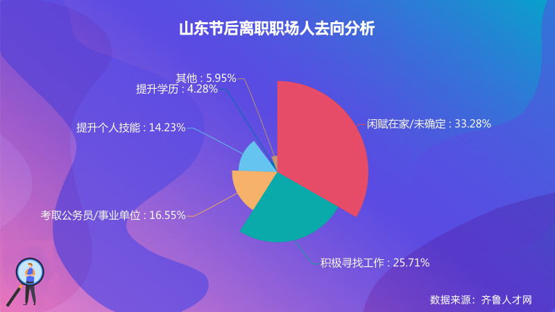 眾所周知,往常職場(chǎng)人離職后都會(huì)積極求職,尋找新的“下家”,但今年節(jié)后卻呈現(xiàn)出與往常不同的態(tài)勢(shì)。如上圖齊魯人才網(wǎng)數(shù)據(jù)顯示,閑賦在家/未確定成為山東節(jié)后離職職場(chǎng)人的第一去向,其占比高達(dá)33.28%;選擇積極尋找工作者僅為25.71%。畢竟受疫情影響而導(dǎo)致的企業(yè)暫時(shí)停工,延遲復(fù)工,或者線上辦公等等的情況,自然會(huì)影響企業(yè)原本的招聘計(jì)劃,在這個(gè)時(shí)間節(jié)點(diǎn),企業(yè)招聘暫緩,或者延后面試時(shí)間,無(wú)疑給想要找工作的求職者造成不便,因此離職職場(chǎng)人求職積極性有所降低。除此之外,有16.55%和14.23%的職場(chǎng)人選擇在離職后考取公務(wù)員/事業(yè)單位以及提升個(gè)人技能;4.28%的職場(chǎng)人選擇離職后提升個(gè)人學(xué)歷,5.95%的職場(chǎng)人選擇其他去向。