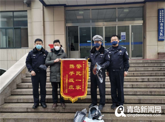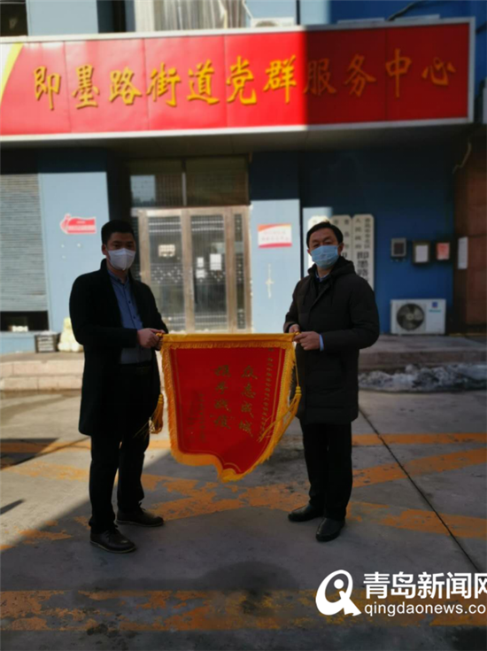 即墨路街道辦事處工作人員將一幅繡有“眾志成城攜手戰(zhàn)疫”的錦旗送到趙維城董事長(zhǎng)的手中,同時(shí)向他表示感謝。