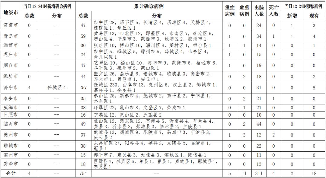 2020年2月22日12-24時(shí),山東省報(bào)告新增新型冠狀病毒肺炎確診病例4例,累計(jì)確診病例754例(含重癥病例5例,危重癥病例11例,治愈出院311例,死亡病例4例);新增疑似病例2例,現(xiàn)有疑似病例18例。截至目前,追蹤到密切接觸者16562人,已解除醫(yī)學(xué)觀察14638人,診斷為疑似或確診病例291例,尚有1633人正在接受醫(yī)學(xué)觀察。