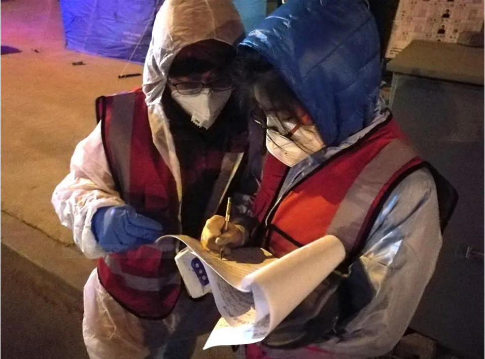 深夜11點正是人們剛剛進入夢鄉(xiāng)的好時候,多想再睡一會兒?。∪欢徛暰褪敲?,鈴聲就是沖鋒號。大家匆忙穿好防護服,檢查帶好設(shè)施,沖進漆黑的夜幕,提前趕到阻疫檢查卡口站,與區(qū)衛(wèi)健局、公安分局、交警大隊的同志們匯合后,便投入到緊張的“戰(zhàn)斗”中。