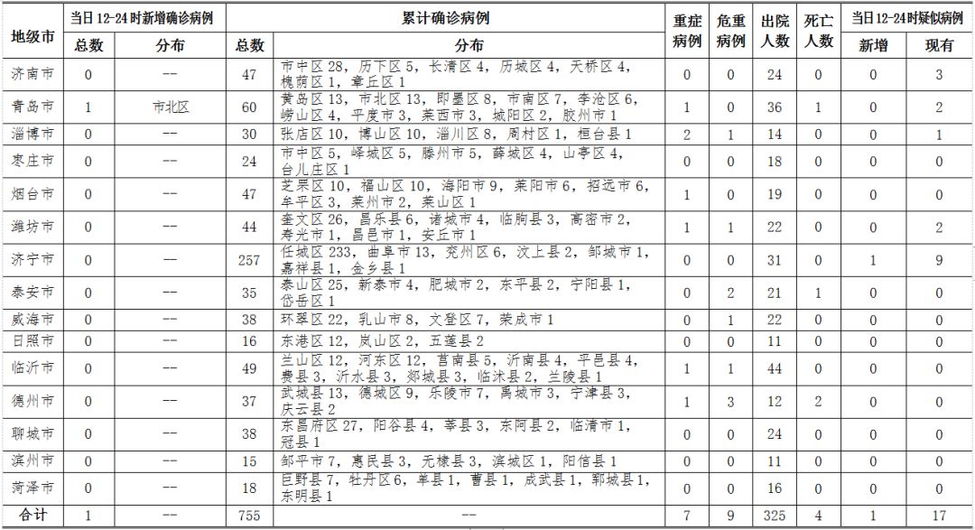 2020年2月23日12-24時,山東省報告新增新型冠狀病毒肺炎確診病例1例,累計確診病例755例(含重癥病例7例,危重癥病例9例,治愈出院325例,死亡病例4例);新增疑似病例1例,現(xiàn)有疑似病例17例。截至目前,追蹤到密切接觸者16660人,已解除醫(yī)學(xué)觀察14855人,診斷為疑似或確診病例291例,尚有1514人正在接受醫(yī)學(xué)觀察。