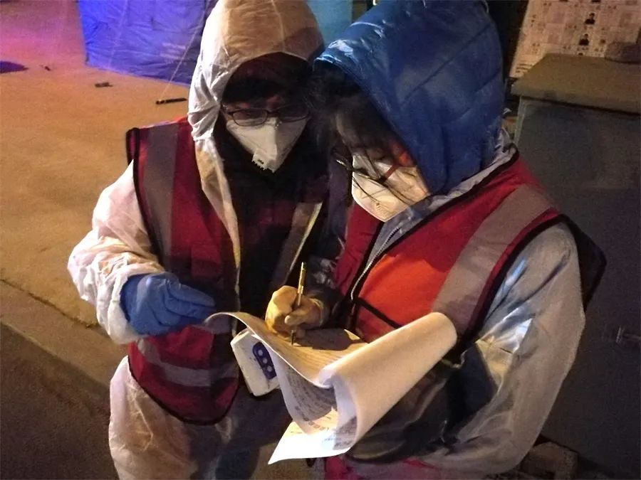 深夜11點正是人們剛剛進入夢鄉(xiāng)的好時候,多想再睡一會兒??!然而鈴聲就是命令,鈴聲就是沖鋒號。大家匆忙穿好防護服,檢查帶好設施,沖進漆黑的夜幕,提前趕到阻疫檢查卡口站,與區(qū)衛(wèi)健局、公安分局、交警大隊的同志們匯合后,便投入到緊張的“戰(zhàn)斗”中。