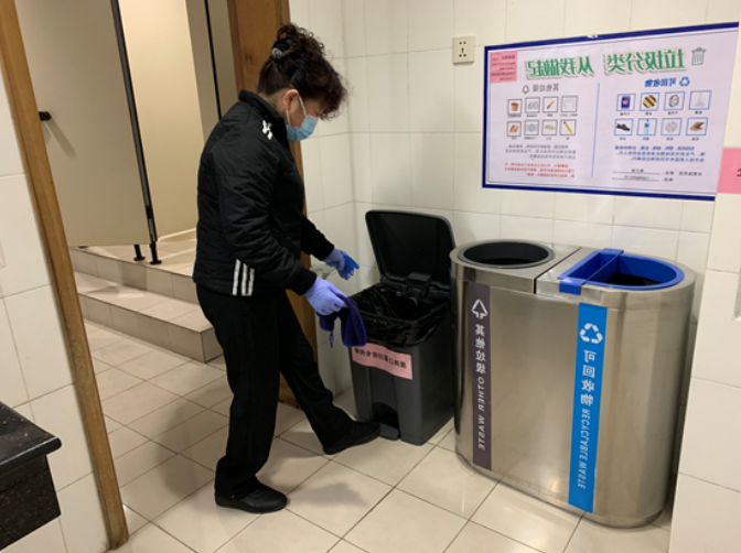 物業(yè)員工由班長李文娟帶領(lǐng)保潔部11名保潔人員對(duì)大樓辦公場所實(shí)行日常消殺。李文娟、王秀娟等保潔人員放棄休假,加班加點(diǎn),實(shí)行每日定時(shí)消毒,始終保持高度警惕,從嚴(yán)從細(xì)抓好防疫工作。