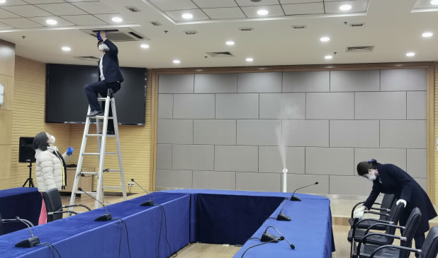 辦公室程穎每天對(duì)延吉路辦公樓公共會(huì)議室、接待室做好桌椅、地面、空調(diào)、話筒擦拭及使用次氯酸消毒機(jī)進(jìn)行空氣消毒等工作,確保會(huì)議室使用安全、放心。
