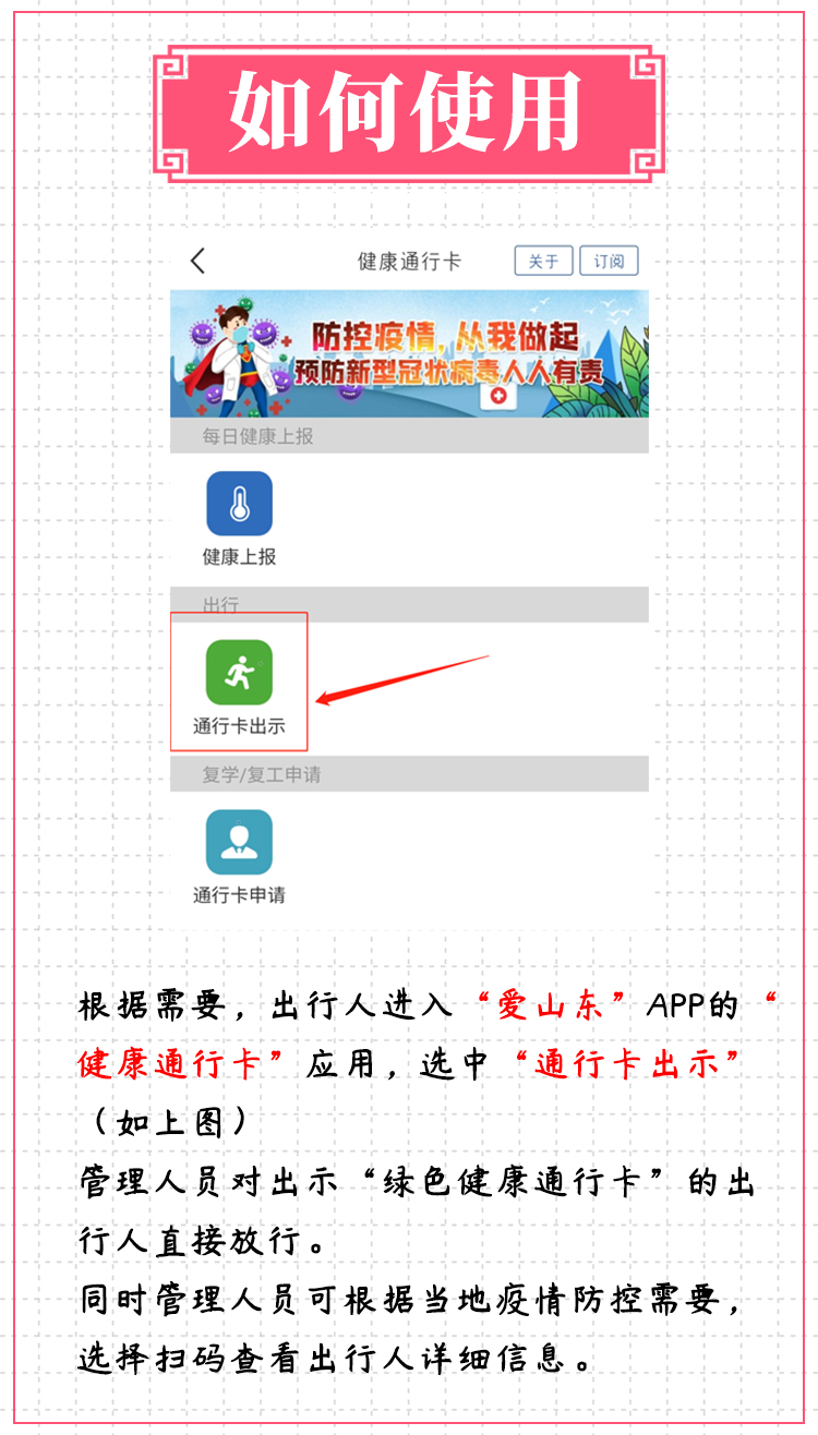 齊魯網(wǎng)·閃電新聞2月25日訊 為做好新冠肺炎疫情防控工作,有序推動(dòng)復(fù)工復(fù)學(xué),山東省委疫情處置工作領(lǐng)導(dǎo)小組辦公室下發(fā)通知,決定依托電子健康卡開通線上辦理復(fù)工復(fù)學(xué)人員電子健康通行卡業(yè)務(wù)。為方便廣大用戶,目前山東政務(wù)服務(wù)“愛山東”APP已上線“電子健康卡”,打開手機(jī)即刻申請(qǐng),一卡在手,快速通行,辦事輕松,更愛山東!