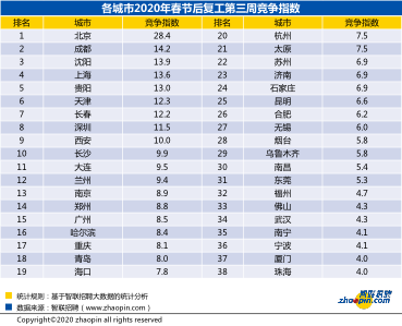 從競爭指數(shù)看,北京以28.4的競爭指數(shù)再次成為第一位,武漢的競爭指數(shù)較上一周的3.7雖有小幅上漲至4.3,但熱度排名下降兩位,這也與武漢以疫情防控為主,企業(yè)推遲復(fù)工時間至三月之后不無關(guān)系。