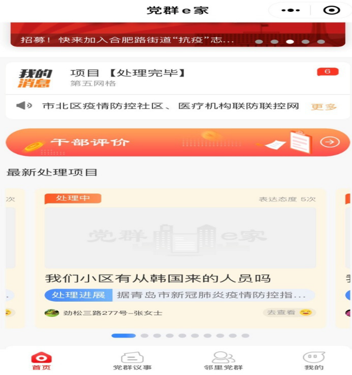 憑借著便民性和實用性,及時傾聽民情收集民意,為民解決痛點堵點問題,推動小事不出網(wǎng)格、大事不出社區(qū),“黨群e家”小程序逐漸走進了居民的心坎里?!靶^(qū)樓道內雜物太多,能否幫忙清理一下?”“下雪天老人出門不方便,能否及時清掃一下積雪?”一項項議題承載了居民們的殷殷期盼,而網(wǎng)格員及時響應、部門間及時聯(lián)動、問題及時得到化解,也為疫情期間居民足不出戶解決問題找到了出口、提供了保障。“黨群e家”小程序的靈活運用,真正實現(xiàn)了民有所呼,格有所應。