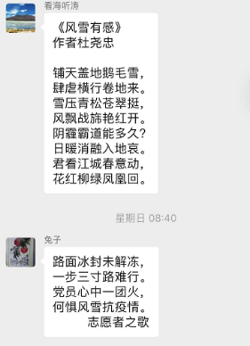 “大雪冰封路難行,腳步踉蹌步履羸。街頭體察民情事,戰(zhàn)斗堡壘雪中凝?!泵鎸?yán)峻疫情,開平路街道陽春詩社老師們的生活也不會因此而被按上“暫停鍵”,他們在家為自己、為大家充電,創(chuàng)作一首首令人振奮、令人感動、令人深思的“抗疫詩篇”,傳播衛(wèi)生健康知識、歌頌一線工作人員、教育和引導(dǎo)群眾、鼓舞士氣,增強共克時艱的信心。