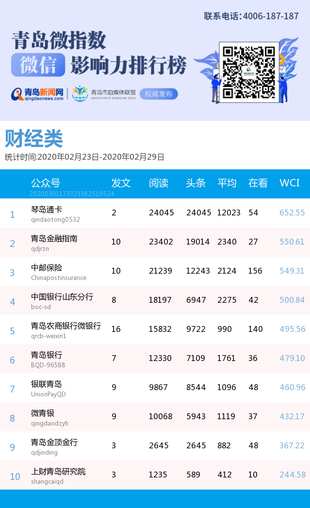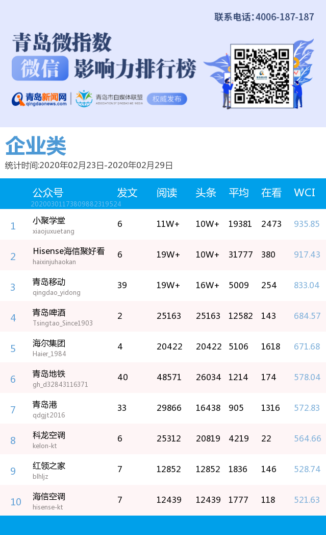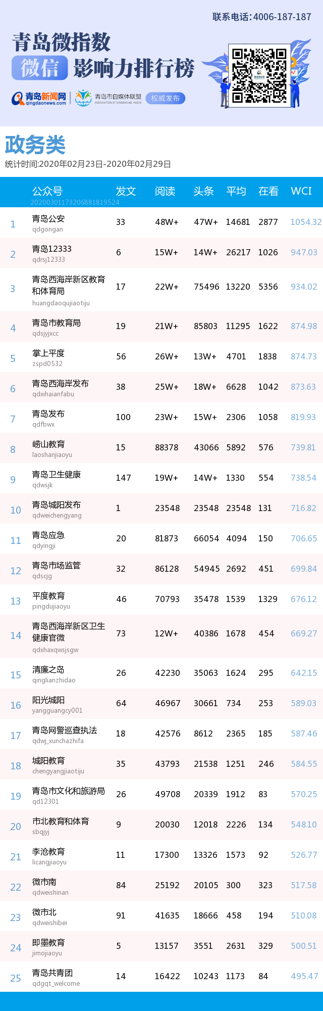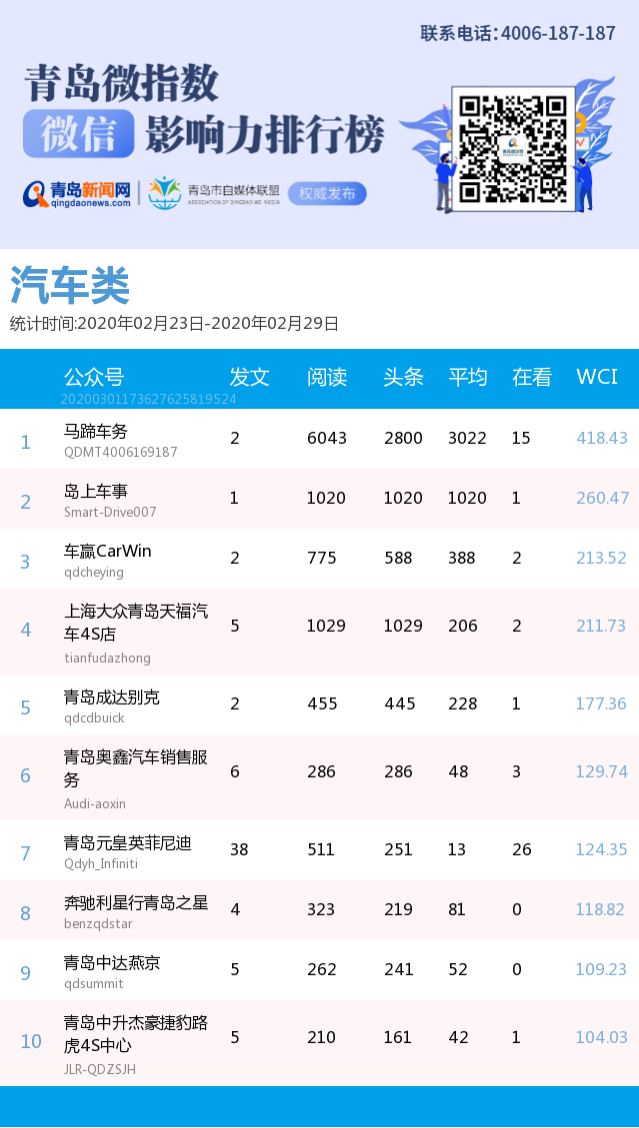 3、本次榜單收錄了青島14個行業(yè)微信公眾號,如您的賬號暫未收錄,可聯(lián)系4006-187-187。
