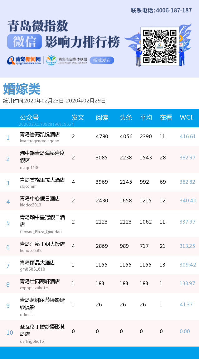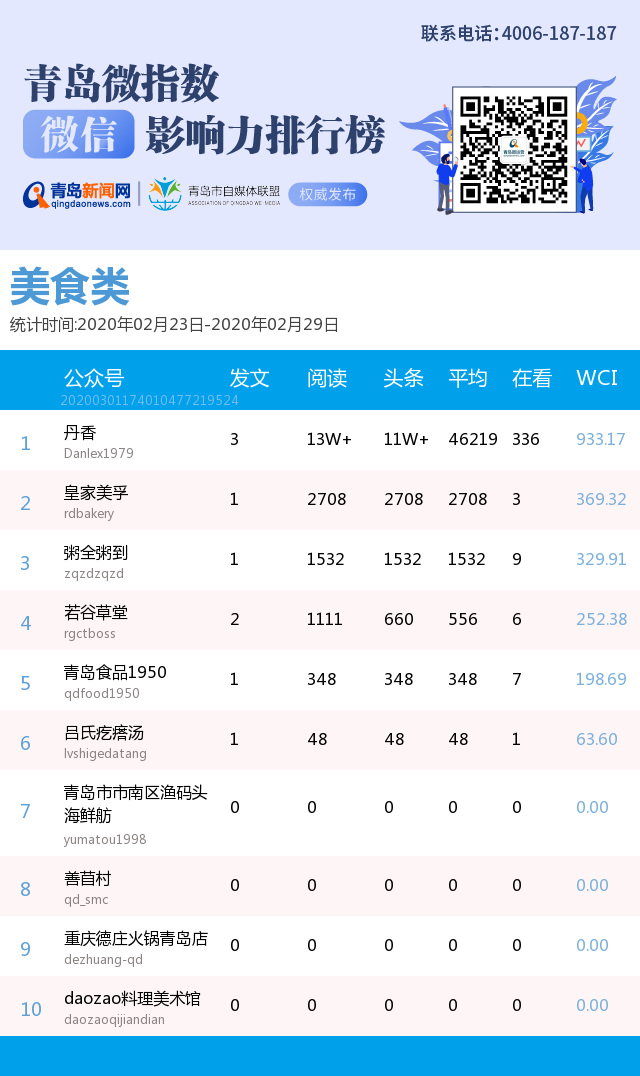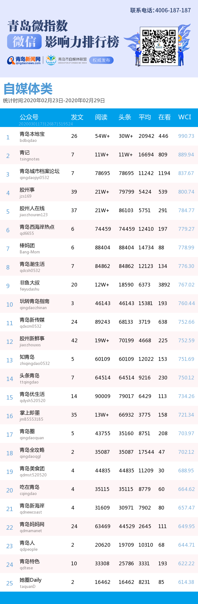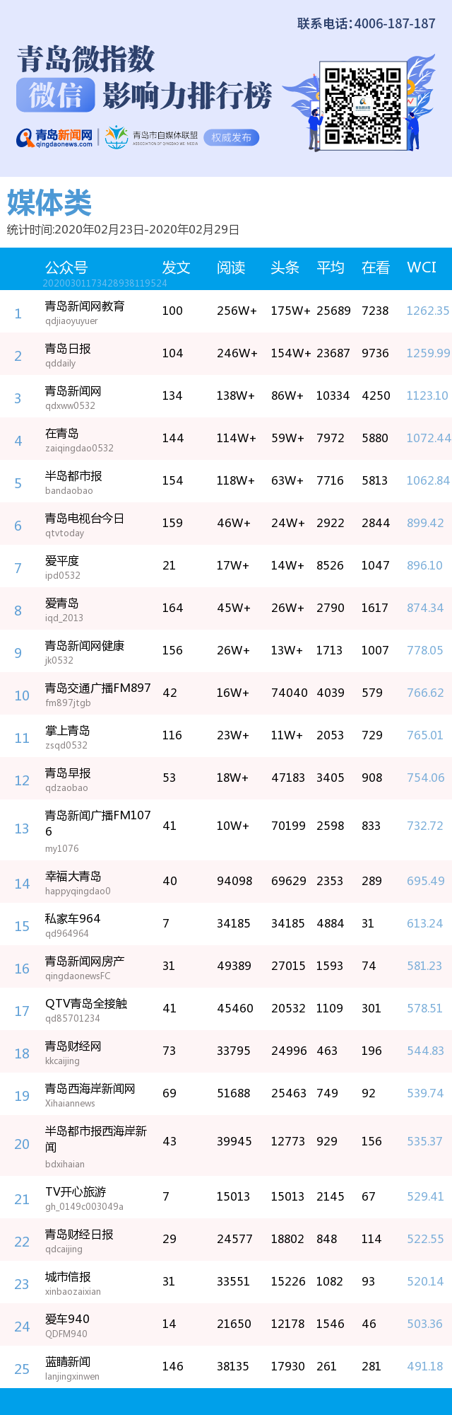 3、本次榜單收錄了青島14個行業(yè)微信公眾號,如您的賬號暫未收錄,可聯(lián)系4006-187-187。