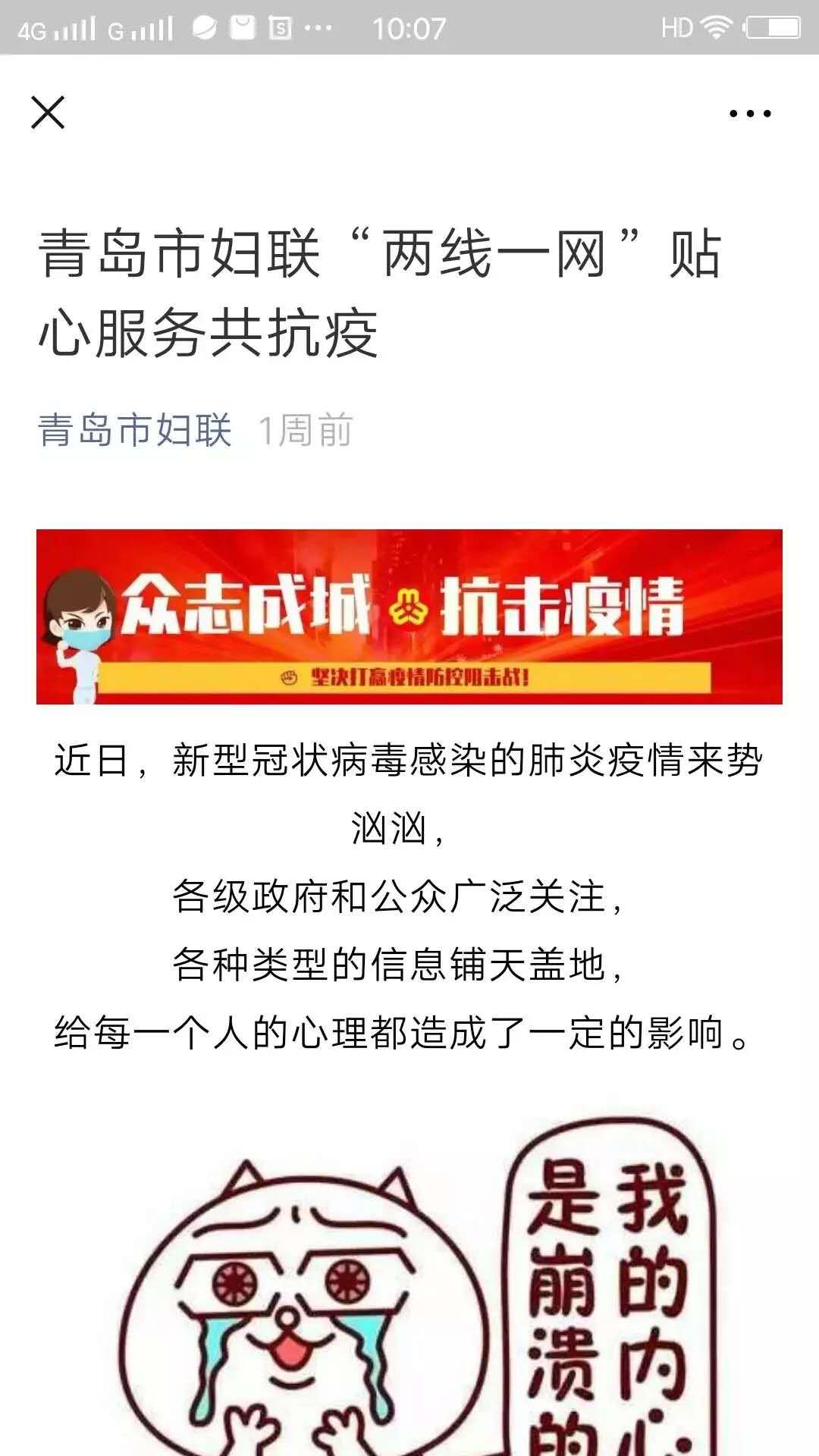 四、重點(diǎn)關(guān)注,深入防控一線為婦女群眾排憂解難。平度市婦聯(lián)為助力青島某醫(yī)療衛(wèi)生用品有限公司生產(chǎn)護(hù)目鏡和醫(yī)用口罩,組織4名心理輔導(dǎo)志愿者為90名女職工提供心理援助并及時解決女職工的后顧之憂。城陽區(qū)婦聯(lián)對被確診為新型冠狀病毒感染的兩位患者,聯(lián)合城陽區(qū)人民醫(yī)院,委托心理門診醫(yī)生為兩位患者進(jìn)行了心理疏導(dǎo),通過采取暗示治療等方法,幫助患者穩(wěn)定情緒,樹立戰(zhàn)勝病魔的信心。目前,一位患者已治愈出院,另一位患者按照青島市統(tǒng)一要求進(jìn)行轉(zhuǎn)院治療。針對某社區(qū)部分居民因確診病例出現(xiàn)恐慌心理的情況,城陽區(qū)婦聯(lián)通過小區(qū)物業(yè)在業(yè)主群里及時推送心理服務(wù)方式,幫助居民舒緩緊張情緒。西海岸新區(qū)婦聯(lián)安排2名志愿者參與新區(qū)疫情防控心理援助熱線工作,運(yùn)用專業(yè)心理知識,耐心疏導(dǎo)求助者的不良情緒,送上娘家人的關(guān)愛,把服務(wù)延伸到婦女群眾生活的最小單元。