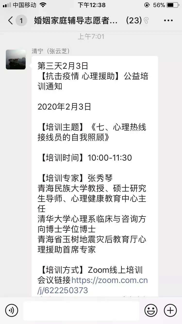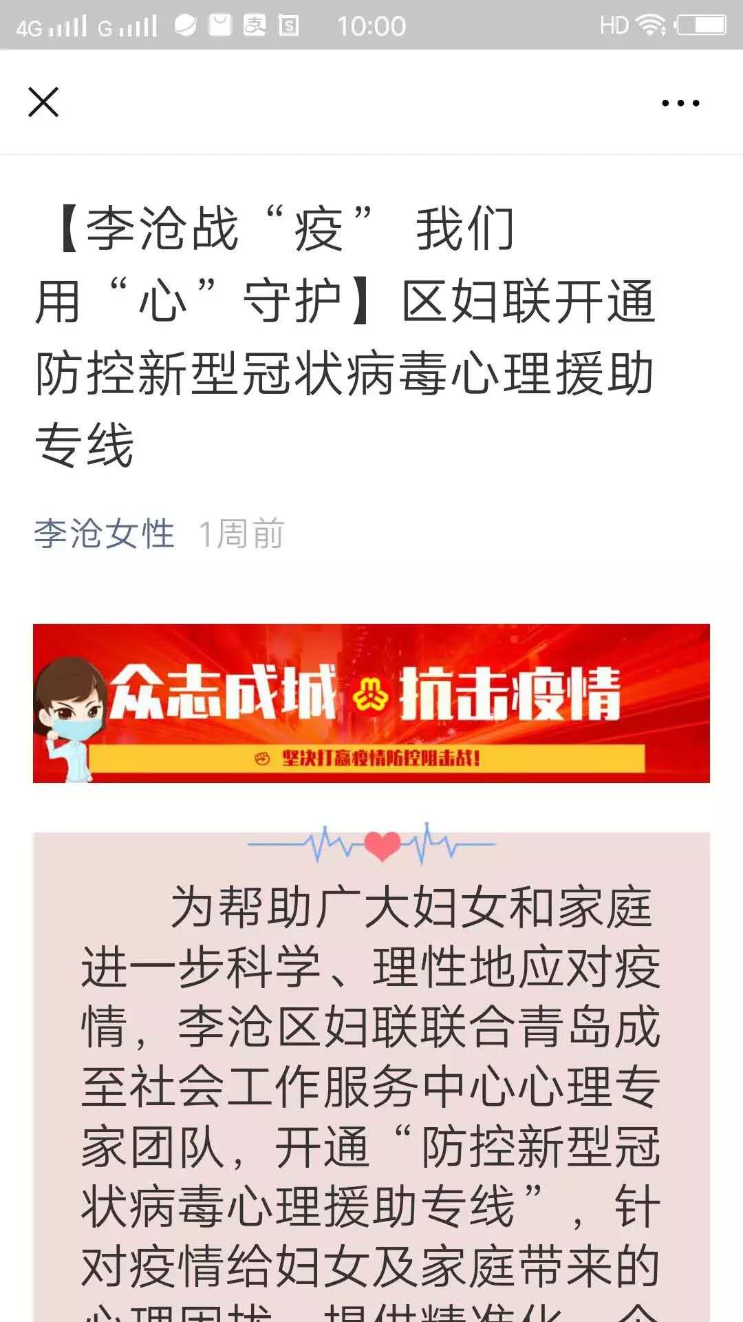 一是搭建平臺,暢通“兩線一網(wǎng)”為婦女群眾提供疫情防控心理咨詢。疫情發(fā)生后,市婦聯(lián)及時搭建了“兩線一網(wǎng)”服務(wù)平臺,即18863905891心理援助、12338婦女維權(quán)公益服務(wù)兩條熱線和蓮姐QQ:1518126767咨詢渠道,還將辦公電話85911638轉(zhuǎn)接至權(quán)益部信訪接待員的手機(jī)上,確保24小時可以接聽,為婦女群眾提供及時、周到的服務(wù)。各區(qū)市婦聯(lián)也紛紛將心理咨詢、婚姻家庭輔導(dǎo)從線下服務(wù)轉(zhuǎn)為線上服務(wù),組建了由婚姻家庭咨詢師、心理咨詢師組成的志愿服務(wù)隊伍,公布了志愿者手機(jī)號碼,建立起一套心理危機(jī)干預(yù)機(jī)制。市北區(qū)婦聯(lián)聯(lián)合青島好時光社會服務(wù)中心,李滄區(qū)婦聯(lián)聯(lián)合青島成至社會工作服務(wù)中心,城陽區(qū)婦聯(lián)聯(lián)合青島瑞陽心語、幸福人生心理援助志愿服務(wù)隊,膠州市婦聯(lián)聯(lián)合"百合"婚姻家庭輔導(dǎo)協(xié)會開通“防控新型冠狀病毒心理援助”專線,提供緊急心理危機(jī)干預(yù)和心理疏導(dǎo)服務(wù)。萊西市、即墨市婦聯(lián)建立了心理疏導(dǎo)微信群,面向廣大家庭提供線上心理服務(wù)。疫情期間,全市共提供專業(yè)心理疏導(dǎo)和維權(quán)服務(wù)500余人次。