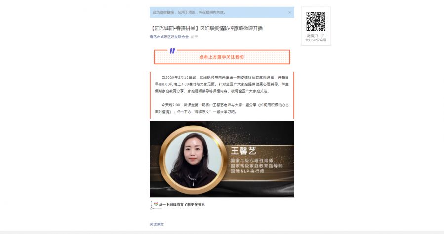 二是廣泛宣傳,開通“線上課堂”為婦女群眾送上疫情防控維權(quán)知識。在青島市婦聯(lián)微信公眾號開設(shè)“最新疫情”專題,及時發(fā)布黨中央、省、市委疫情防控的部署要求和最新疫情動態(tài)。在婦聯(lián)微信公眾號和各級工作群重點(diǎn)轉(zhuǎn)發(fā)了《關(guān)于依法懲治妨害新型冠狀肺炎疫情防控違法犯罪的意見》《返崗復(fù)工你關(guān)心的工資、社保、勞動合同等問題》等事關(guān)婦女兒童切身利益的文章,為婦女兒童在嚴(yán)峻形勢中依法維權(quán)送上法治食糧。在微信公眾號開設(shè)了“琴島?家”護(hù)航指南專欄,圍繞“疫”網(wǎng)情更深,宅家也有愛,講解疫情防控期間婚姻家庭關(guān)系的調(diào)適;開設(shè)“蓮姐維權(quán)開講”專欄,通過以案釋法的形式傳播法律知識,3月1日,第一期《遭遇家暴怎么辦?聽聽連姐怎么說》正式開講。在《反家庭暴力法》實(shí)施四周年之際,同時發(fā)布《四周年!讓我們一起對家庭暴力說“不”》公號文章及《反家庭暴力法》主題海報,在部分公交車車體上宣傳維護(hù)婦女兒童合法權(quán)益的標(biāo)語,在車載視頻上播放反家暴公益短片和宣傳口號。即墨區(qū)婦聯(lián)聯(lián)合區(qū)司法局組織15名律師開展線上婚姻家庭法律服務(wù)。萊西市婦聯(lián)聯(lián)合司法局通過云端直播方式,為婦女群眾宣講疫情防控期間應(yīng)注意的法律常識和反家暴法中的重要內(nèi)容,借助網(wǎng)絡(luò)新媒體打造“互聯(lián)網(wǎng)+”普法宣傳新陣地。