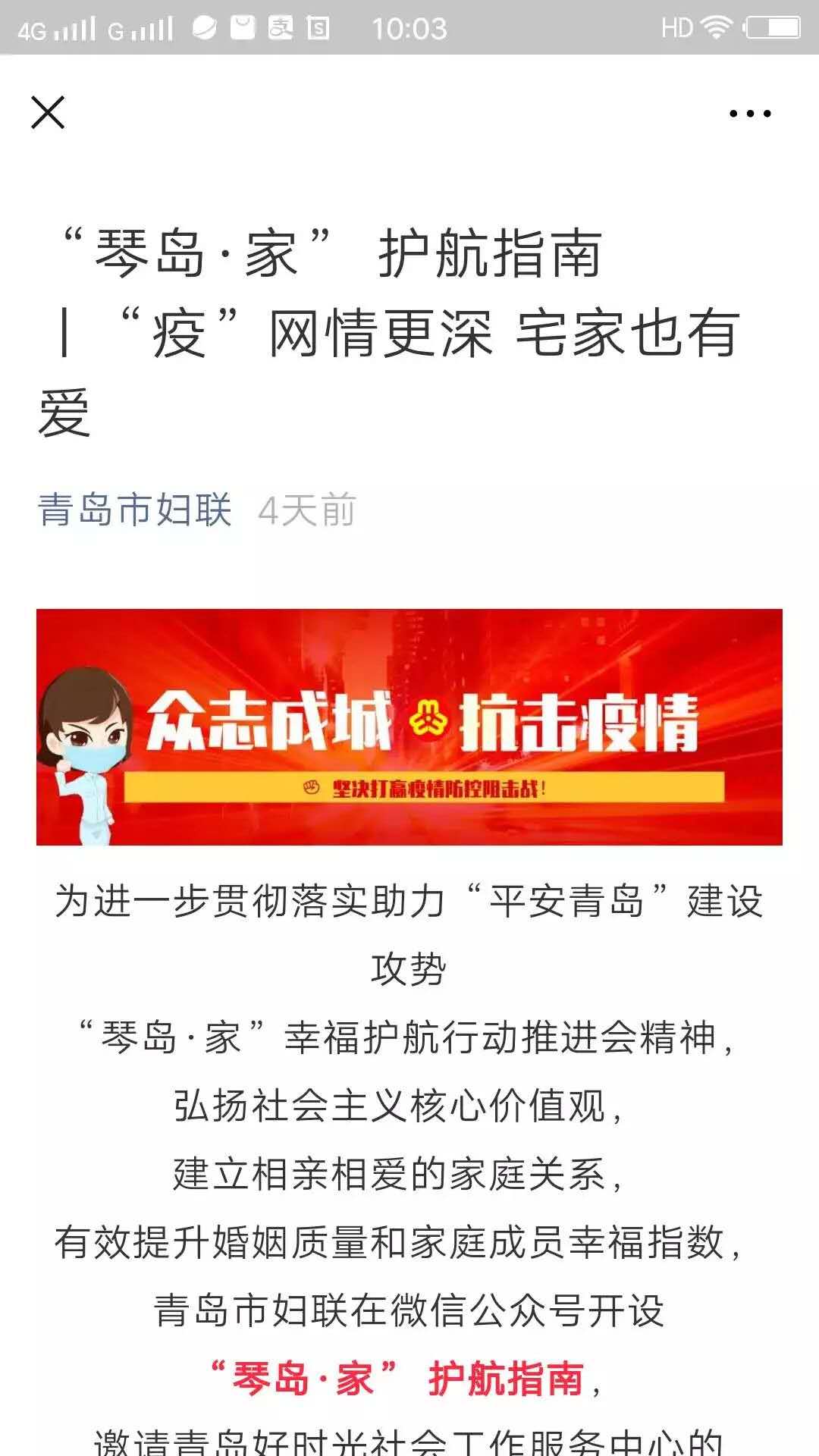 三是化解矛盾,融合“網(wǎng)絡(luò)服務(wù)”為婦女群眾守護(hù)家庭平安。實(shí)行疫情期間信訪案件報告制度,及時報送市信訪局涉及疫情信訪案件2起,辦結(jié)省婦聯(lián)轉(zhuǎn)辦武漢籍人士返青隔離安置、女職工工傷認(rèn)定2起案件,辦結(jié)12345轉(zhuǎn)辦5起案件,妥善處置網(wǎng)絡(luò)輿情案件6起。各區(qū)市婦聯(lián)在參與社區(qū)防疫、入戶宣傳等工作時,大力宣傳全國、青島市抗疫心理援助熱線電話,密切關(guān)注家庭矛盾糾紛、家庭暴力等情況,及時為有需求的人員和家庭,提供輔導(dǎo)幫助。城陽區(qū)婦聯(lián)發(fā)動維權(quán)志愿者錄制了100余個疫情心理調(diào)適和家庭教育方面的課程,通過微信群推送宣講100余次,服務(wù)4000多個家庭。市南區(qū)婦聯(lián)協(xié)調(diào)志愿者錄制家庭關(guān)系調(diào)適公益微課堂,分享疫情期間讓婚姻家庭關(guān)系更和諧的先進(jìn)理念和方法。萊西市婦聯(lián)組織心理疏導(dǎo)志愿者在心理疏導(dǎo)群內(nèi)分享生活感悟、抗疫心得、家庭成員相處技巧等,做好群眾思想精神引領(lǐng)。
