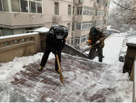 上圖為:退役士兵姜鐵華(左)清掃積雪,方便居民出行。