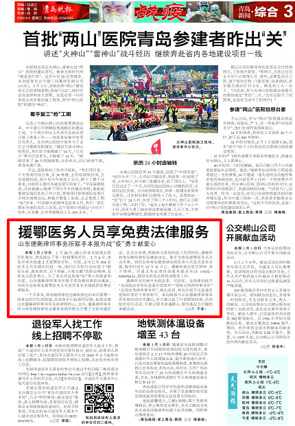 1月24日,隨山東省支援湖北醫(yī)療隊(duì)集結(jié),青島派出了第一批援鄂醫(yī)療隊(duì)。2月8日,青島市再次組建2支援鄂醫(yī)療隊(duì)。目前,全市已有304名醫(yī)務(wù)人員在湖北抗疫一線,他們以實(shí)際行動(dòng)弘揚(yáng)了“敬佑生命、救死扶傷、甘于奉獻(xiàn)、大愛(ài)無(wú)疆”的職業(yè)精神,是青島人民的勇士。為表達(dá)出對(duì)奮戰(zhàn)在抗“疫”一線勇士的敬意與關(guān)愛(ài),山東德衡律師事務(wù)所(以下簡(jiǎn)稱“德衡所”)聯(lián)手青島晚報(bào)掌控全媒體,共同為全體青島援鄂醫(yī)務(wù)人員及其直系親屬提供免費(fèi)法律咨詢服務(wù)。