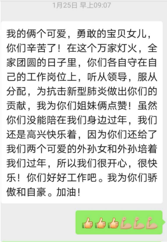 而提到自己的孩子和家人,王霞說,已經(jīng)將近一個月的時間沒有見到孩子了,因為她和丈夫幾乎都屬于白加黑、五加二的工作狀態(tài),孩子不得不送回外公外婆家,在近一個半月的疫情防控一線上,她承認曾經(jīng)偷偷流過兩次眼淚,一次是緩解釋放壓力,另一次則是2020年正月初一。初一早上,在單位值守了一晚的她收到母親的微信,頓時淚流滿面,“我的倆個可愛,勇敢的寶貝女兒,你們辛苦了!在這個萬家燈火,全家團圓的日子里,你們各自守在自己的工作崗位上,聽從領導,服從分配,為抗擊新型肺炎做出你們的貢獻,我為你們姐妹倆點贊!雖然你們沒能陪在我們身邊過年,我們還是高興快樂的,因為你們還給了我們兩個可愛的外孫女和外孫培著我們過年,所以我們很開心,很快樂!你們好好工作吧。我為你們驕傲和自豪。加油!”王霞的妹妹是西海岸新區(qū)區(qū)立醫(yī)院一名工作人員,萬家燈火,全家團圓的日子也和姐姐一樣堅守在自己的工作崗位上,父母幫姐妹倆照顧著兩個孩子還不忘為姐妹倆加油,這是她們戰(zhàn)“疫”身后最堅強的親情力量?!拔业拇蠖鄶?shù)同事都和我一樣,這段時間幾乎與家絕緣,有的把兩個年幼孩子都托付給老人;有的第一時間把過年回家的車票退掉;還有好幾個臨時取消婚禮的,我們每個人都在自己的職責崗位上拼盡全力去抗擊疫情。”