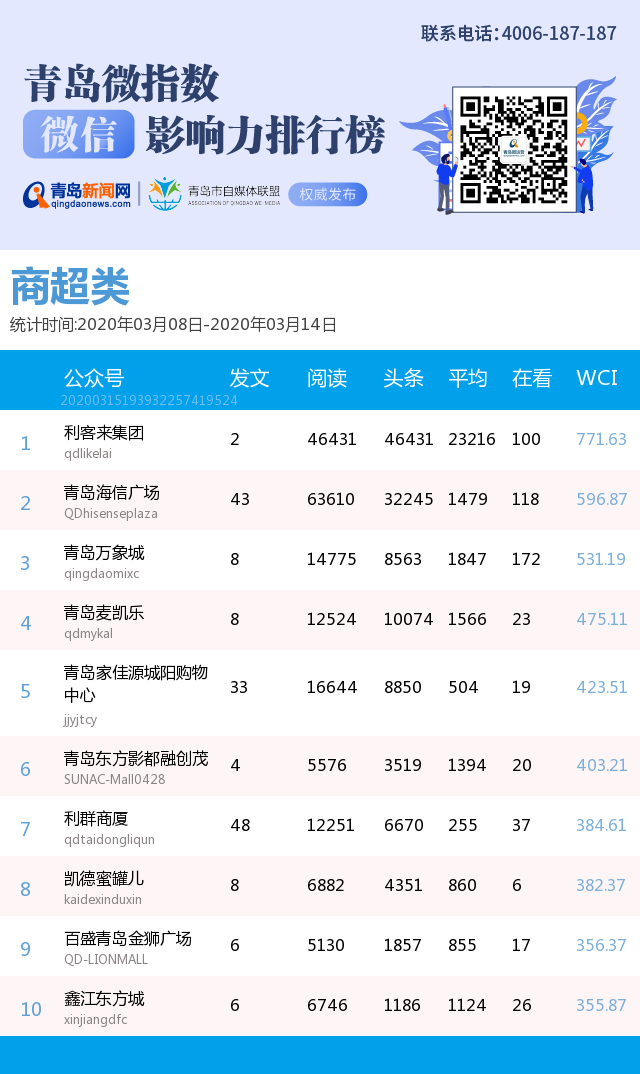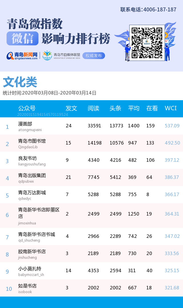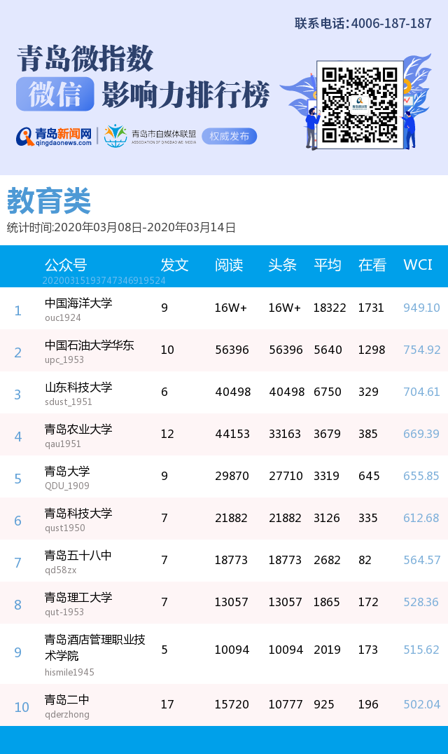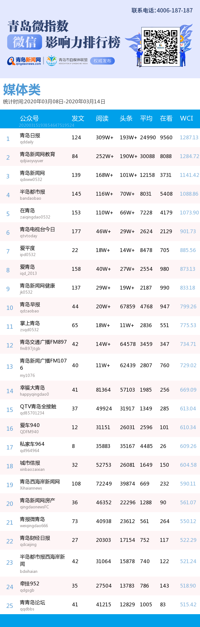 青島新聞網(wǎng)3月16日訊(記者 邢書(shū)玲)由青島新聞網(wǎng)打造的“青島微指數(shù)微信影響力排行榜”今日發(fā)布一周(2020年3月8日-2020年3月14日)榜單。