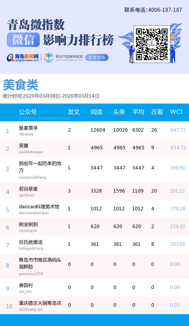 3、本次榜單收錄了青島14個(gè)行業(yè)微信公眾號(hào),如您的賬號(hào)暫未收錄,可聯(lián)系4006-187-187。