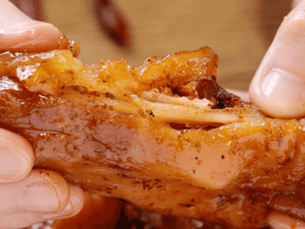 富含膠質(zhì)的鹵豬蹄,撕開時,還有肉眼可見的膠質(zhì)拉絲,吃起來很過癮,愛美的女孩子,吃著更是心花怒放。