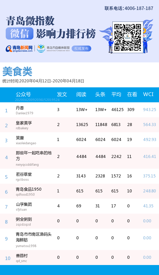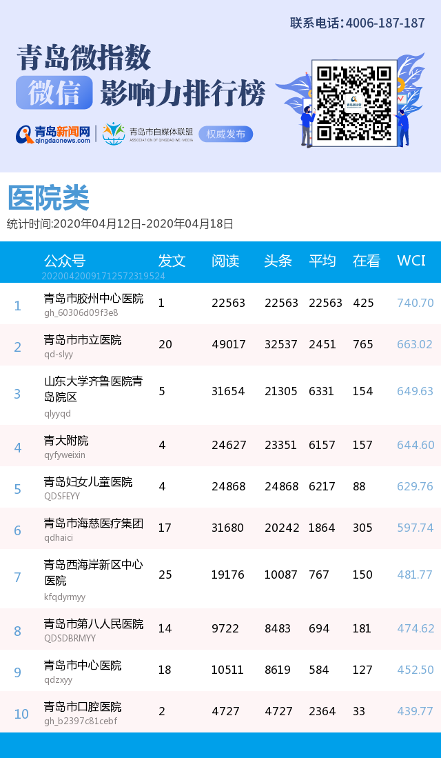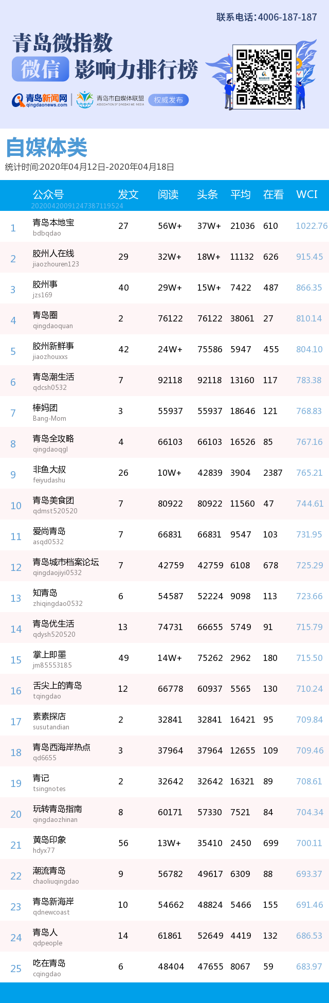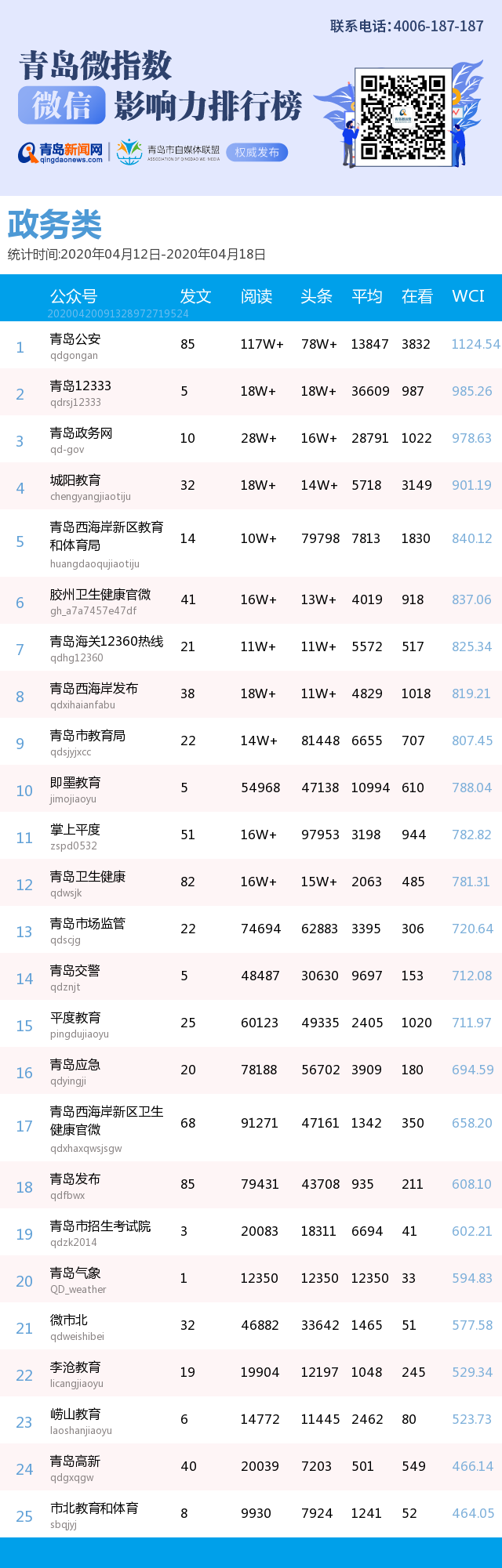 青島新聞網(wǎng)4月20日訊(記者 邢書(shū)玲)由青島新聞網(wǎng)打造的“青島微指數(shù)微信影響力排行榜”今日發(fā)布一周(2020年4月12日-2020年4月18日)榜單。