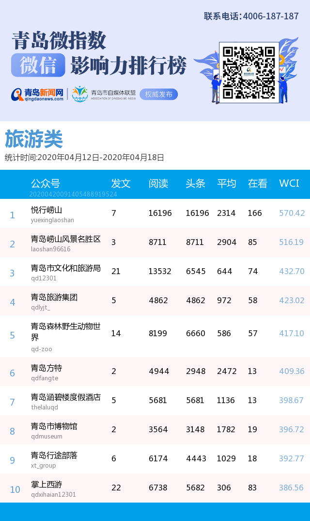3、本次榜單收錄了青島14個(gè)行業(yè)微信公眾號(hào),如您的賬號(hào)暫未收錄,可聯(lián)系4006-187-187。
