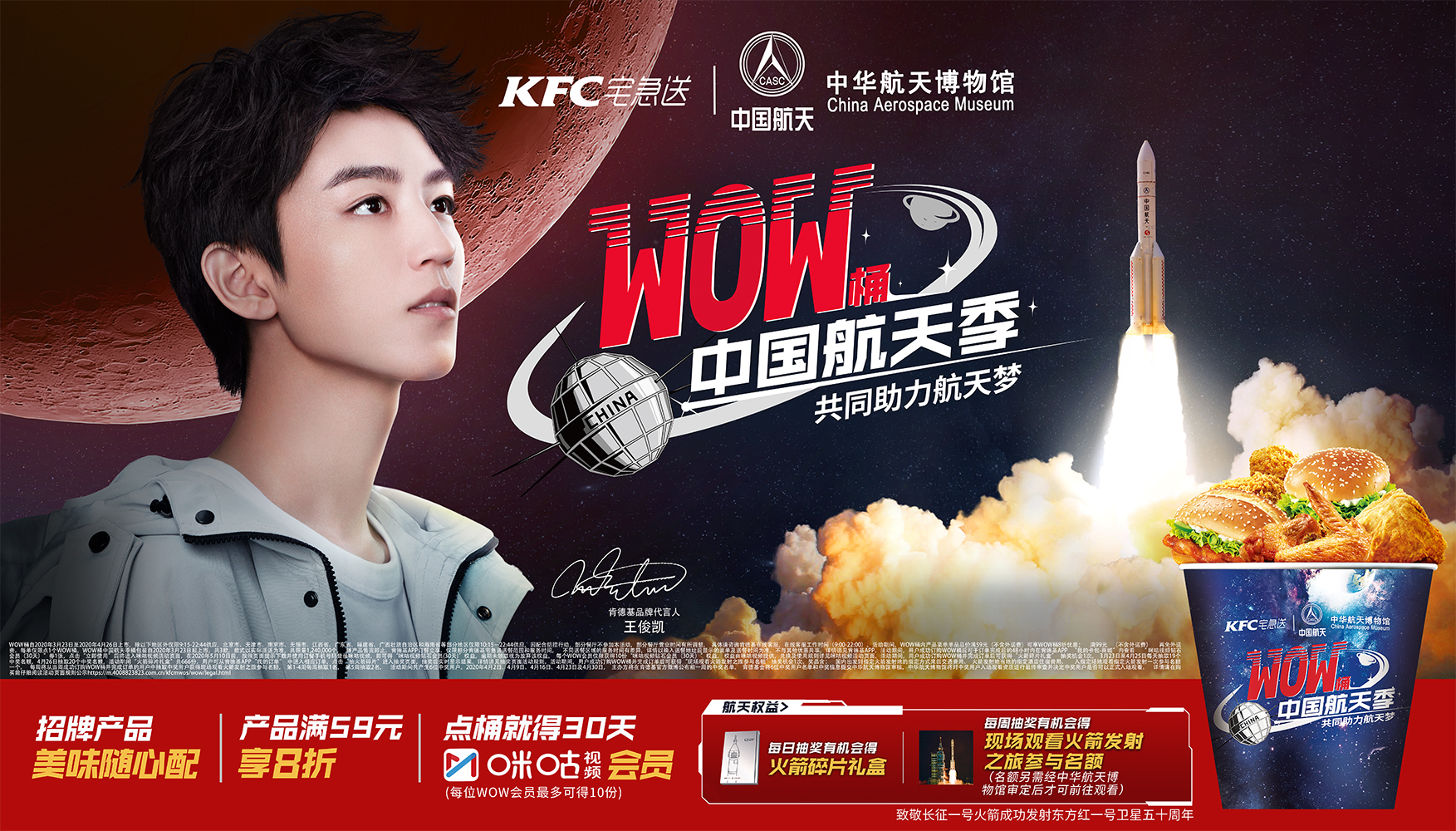 2020年4月24日是第五個中國航天日,同時也是長征一號火箭成功發(fā)射中國第一顆人造衛(wèi)星東方紅一號五十周年紀念日。值此特別的紀念,肯德基宅急送攜手中華航天博物館推出WOW桶中國航天季,匯聚中國航天愛好者心中熱愛,致敬中國航天事業(yè)。