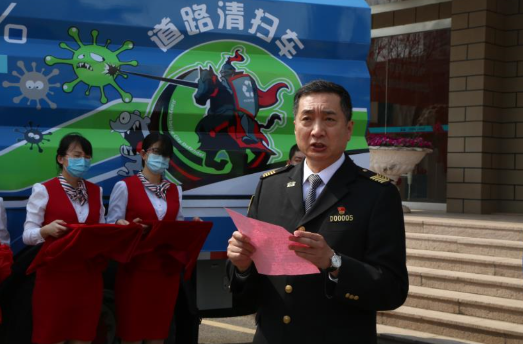 交運(yùn)北潔(青島)環(huán)境有限公司董事長羅惠軍在儀式上對新型道路清掃車作了簡要介紹,他表示,此次新型清掃車的車體涂裝的設(shè)計(jì)突顯了企業(yè)的環(huán)保衛(wèi)士理念,體現(xiàn)了向上騰飛、勇往直前的奮斗精神,并表示交運(yùn)北潔公司將努力把青島市市北區(qū)打造成青島最潔凈城區(qū),力爭把交運(yùn)北潔品牌做大、做強(qiáng),走向全省乃至全國。記者在現(xiàn)場看到,新型道路清掃車外觀變成了非常炫酷的天藍(lán)色,涂裝以騎士為主題,畫面描繪了一名勇敢的騎士騎著戰(zhàn)馬,拿著長槍,將城市所有垃圾和病毒一掃而光的場景,色彩鮮亮,寓意深刻。