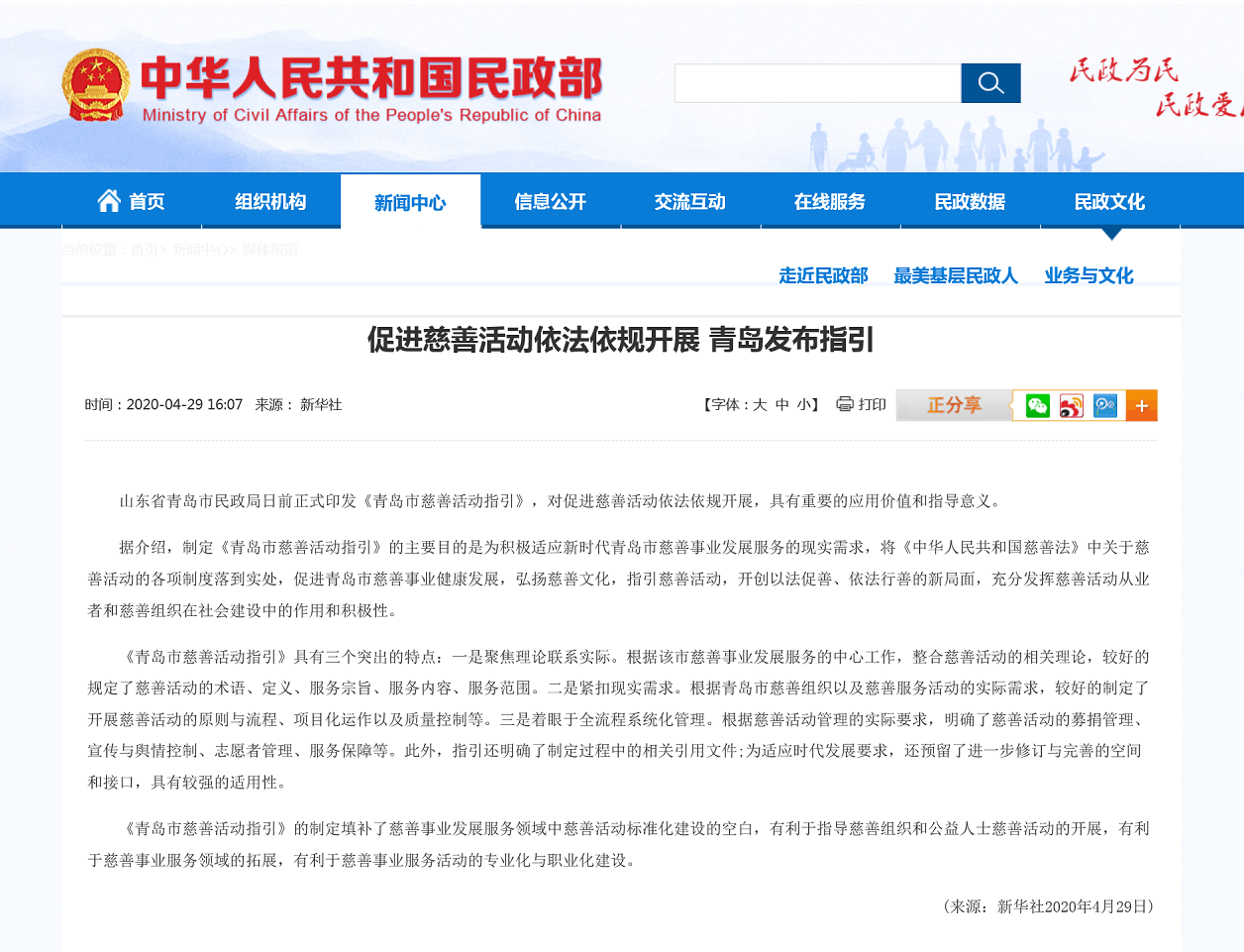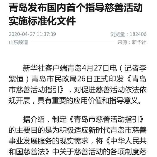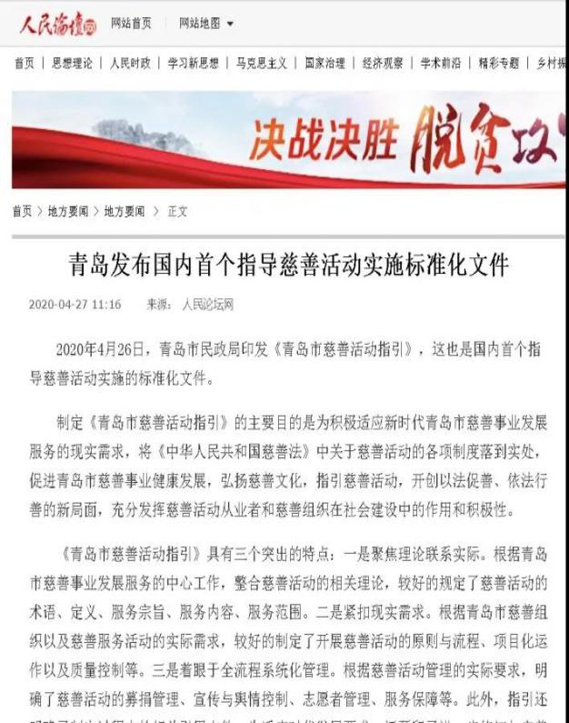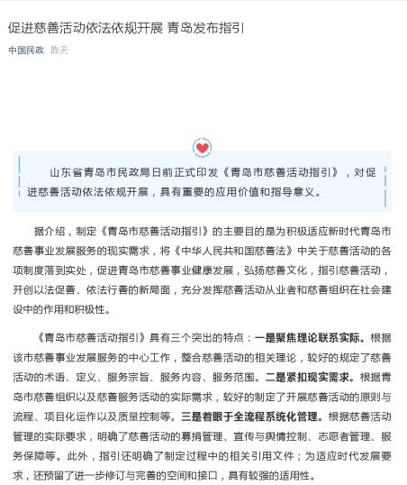 該《指引》的出臺(tái)得到了新華社、人民日報(bào)海外網(wǎng)、人民論壇網(wǎng)、 CCTV公益之聲官網(wǎng)、國家民政部官網(wǎng)、中國民政微信公眾號、光明網(wǎng)、齊魯網(wǎng)等 30余家媒體和網(wǎng)站的關(guān)注宣傳,對推動(dòng)我市慈善工作起到了積極作用。