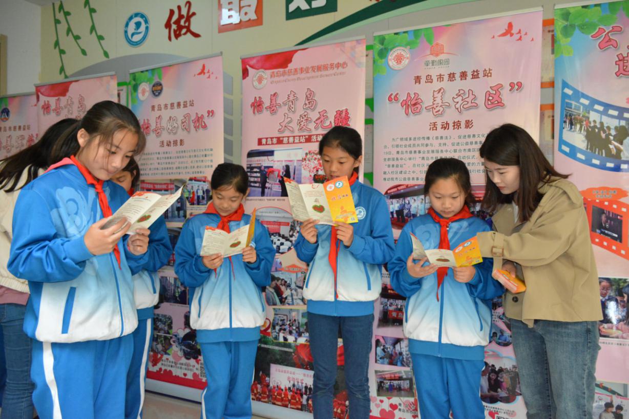 紅島中心小學(xué)的學(xué)生們在青島市慈善益站“怡善悅讀”專區(qū)閱讀《慈善法》相關(guān)書籍