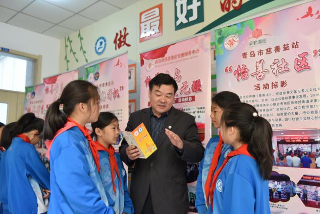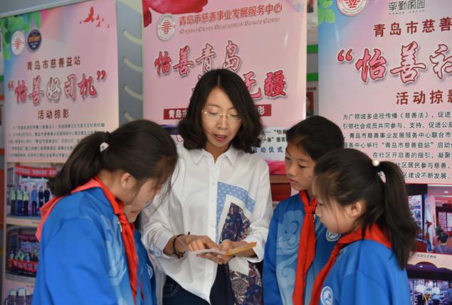 青島市慈善事業(yè)發(fā)展服務(wù)中心工作人員向小學(xué)生發(fā)放《慈善法》宣傳折頁