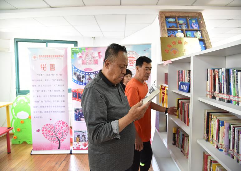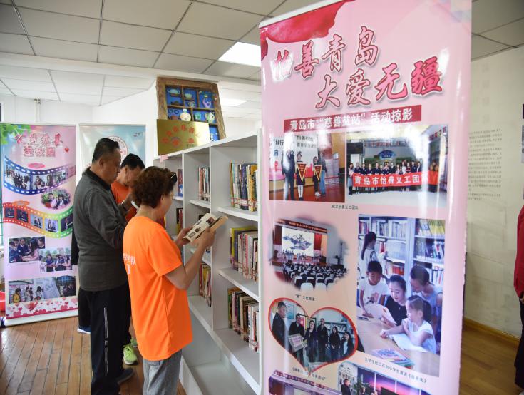社區(qū)居民在青島市慈善益站“怡善悅讀”專區(qū)閱讀《慈善法》相關(guān)書籍
