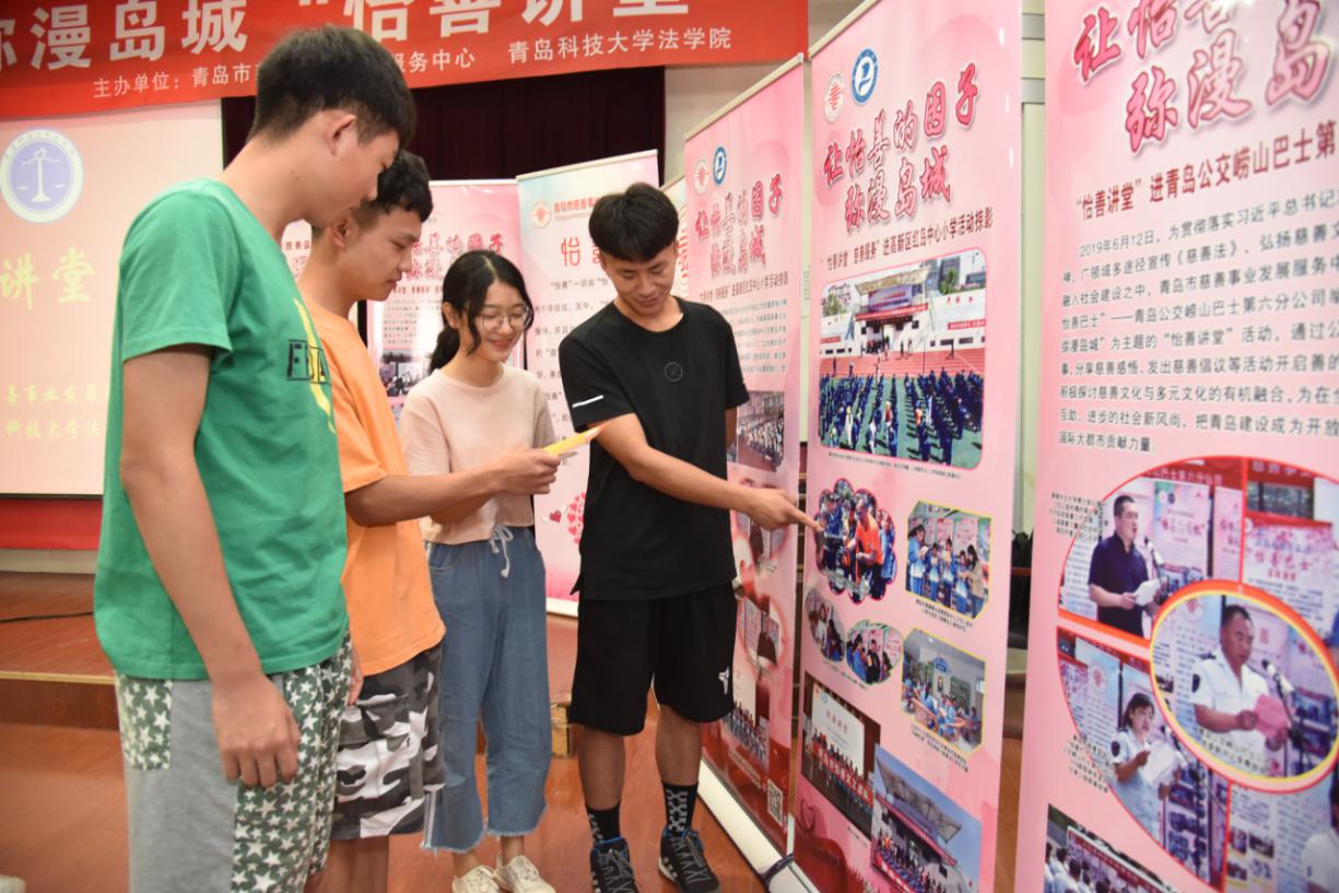 青島科技大學(xué)法學(xué)院學(xué)生瀏覽宣傳《慈善法》和慈善活動掠影的易拉寶