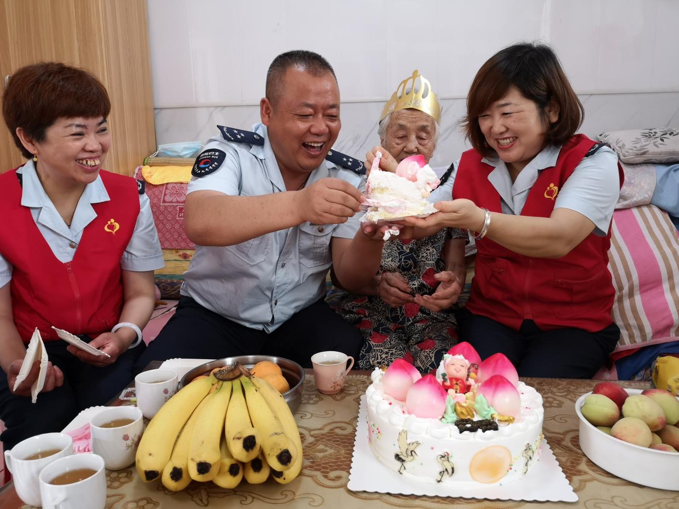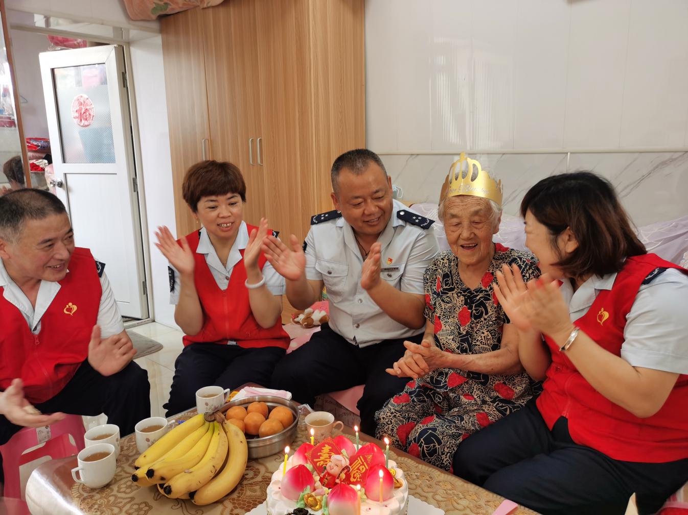 志愿者們還有一件非常高興的事要辦,為結(jié)對的空巢老人王淑蘭阿姨慶賀85歲大壽的日子。這是志愿者們連續(xù)五年為王阿姨慶賀生日了,一進門,就看見桌上洗好的杏和新鮮桃子,這是王阿姨在等候志愿者的到來。王阿姨高興的看看這個,瞧瞧那個,拉著志愿者的手有著說不完的話。志愿者們告訴王阿姨今天是特意來為她老人家慶賀85歲大壽的,老人家很是高興和激動,說道,“你們工作這么辛苦,還要時刻惦記我們這些老人讓我說啥好”。志愿者將生日蛋糕打開,寓意著福壽安康的喜慶蛋糕讓人眼前一亮,王阿姨直夸蛋糕做的精美。志愿者們將生日蠟燭點上,共同唱起生日祝福歌,歡樂融合的幸福景象盡顯眼前。