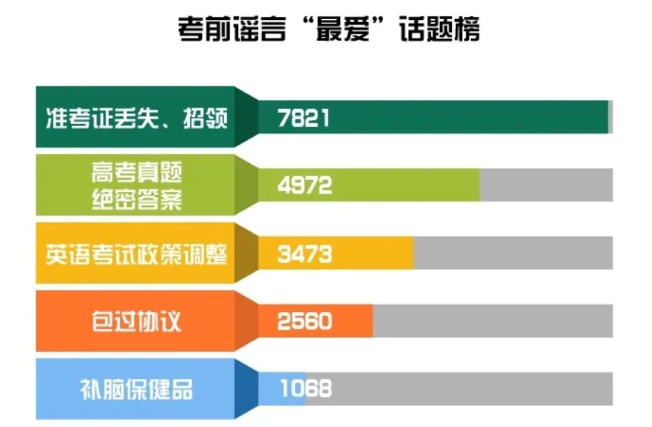 丟準(zhǔn)考證事件每年都有發(fā)生,一方面讓信息真假難辨,迷惑性強(qiáng),不少網(wǎng)民正出于善于轉(zhuǎn)發(fā),給了謠言可乘之機(jī);另一方面,其較高的出現(xiàn)頻率、舊謠新傳等特點(diǎn),也為識(shí)謠辨謠提供了契機(jī)。中國(guó)互聯(lián)網(wǎng)聯(lián)合辟謠平臺(tái)對(duì)近3年此類謠言進(jìn)行梳理,歸納出此類謠言高頻詞,看到它們,就別轉(zhuǎn)了!