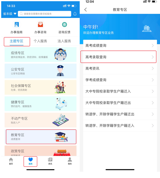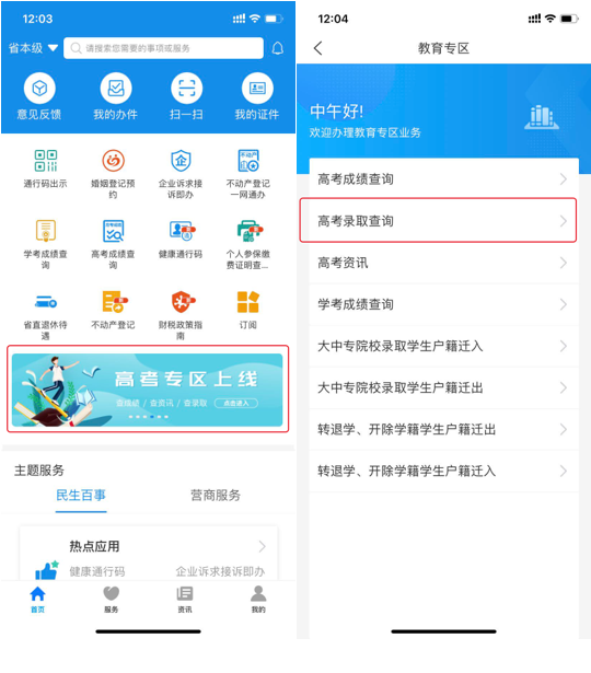 點擊各級分廳“服務(wù)”選項,找到“主題專區(qū)”中的“教育專區(qū)”,高考各項應(yīng)用均有提供。