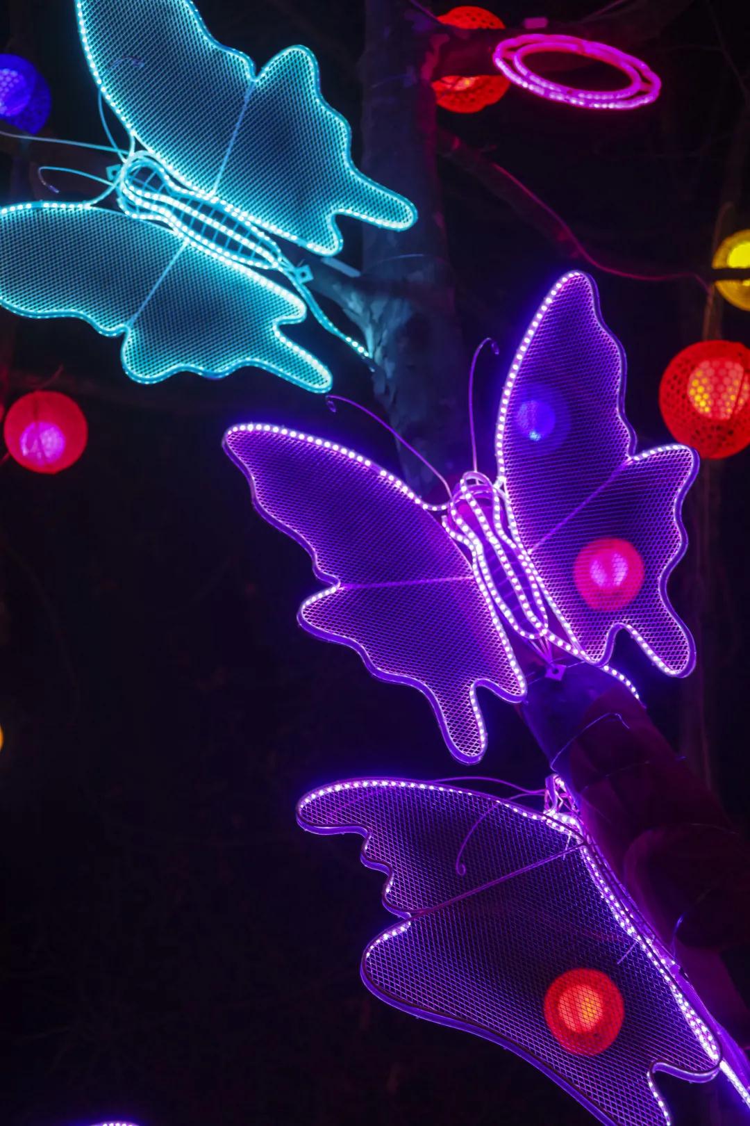 這場(chǎng)“光影秀”可遠(yuǎn)觀,也可近賞。遠(yuǎn)看是一片“星?!?,走近仔細(xì)看掛在樹(shù)上的小燈形狀各異,有閃爍的“星星”,有生動(dòng)的“蝴蝶”,這條路走起來(lái)都有趣了許多。