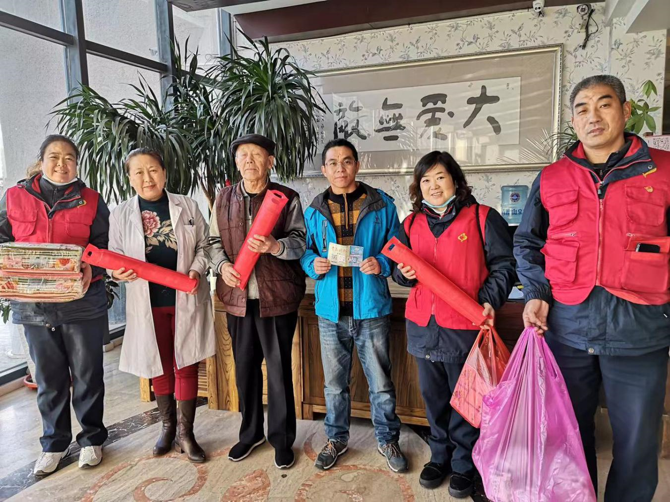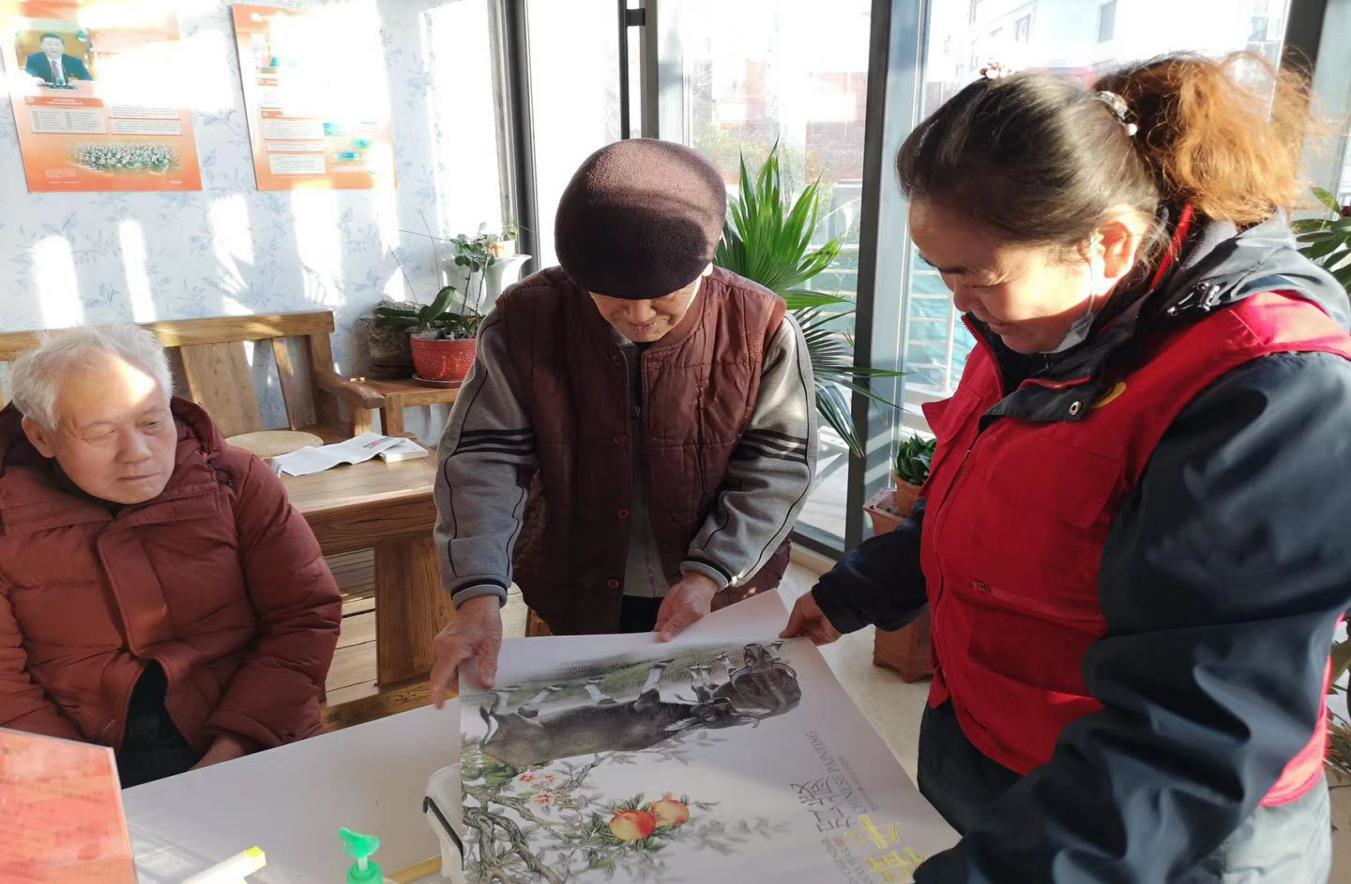 從三位老人家出來,志愿者們開車奔赴香港東路的“山水居”生態(tài)養(yǎng)老中心,探望那里的空巢老人們。受今年新冠疫情影響,每年為“山水居”的老人們慶賀集體生日的活動只能暫停。新的一年即將到來,疫情也得到了很好管控。志愿者們三九嚴寒天為老人們送禮物來了,防疫用的酒精消毒濕巾,洗漱用品毛巾和香皂,一并送上的還有新年掛歷。老人們迫不及待的打開掛歷欣賞,表達感激之情。志愿者孟珂為養(yǎng)老中心的老人們贈送了一份全年報卡,放在讀報角方便更多的老人閱讀觀看。