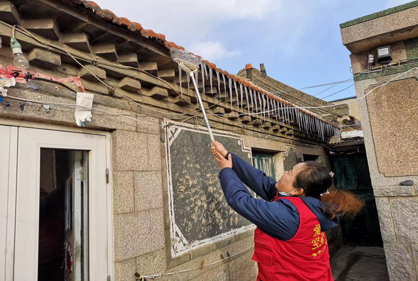 90歲的曲方平大爺正在爐子旁添加煤塊,握著志愿者冰涼的雙手老人即驚喜又心疼,埋怨志愿者零下十幾度的天還來看望他,快坐下暖和暖和。說話間志愿者為老人送上新年掛歷,看著掛歷上的“?!弊郑鬆斦f真喜慶,一年一年真快啊。說話間曲大爺又詢問起他的專職理發(fā)師志愿者李啟筍的病情,這是一直牽掛老人心結的事,當志愿者拿出手機讓曲大爺看志愿者們去探望老大哥的照片時,曲大爺這才放下心,“精神頭氣色還不錯,讓他好好養(yǎng)病。志愿者看到由于積雪融化屋檐下的冰柱像一把把“小尖刀”并排著,志愿者辛偉麗和陳世國立馬找來應手工具掃帚將安全隱患清除。志愿者與曲大爺總有說不完的話語,大爺講著他那個時代工作的一些經驗和故事,眨眼間一個小時過去,當志愿們起身告辭時,老人家笑著說:再聊三分鐘,這是曲大爺對志愿者的不舍之情。志愿者叮囑老人家千萬不能出門,外面地太滑易摔倒,曲大爺在屋內依依不舍的與志愿者揮手告別。