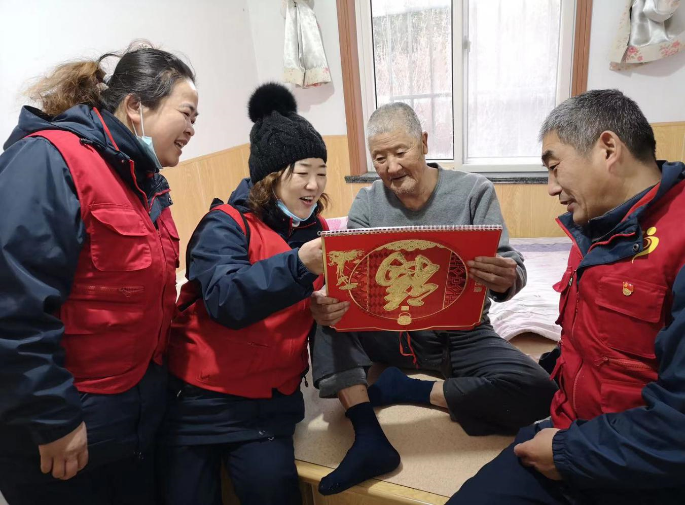 81歲的王祝才大爺正坐在暖炕頭上,有白內障的他看清是志愿者們時,笑容立刻展現?!坝只ㄥX了,還拿了掛歷”。王大爺含糊的話語志愿者們卻聽的真切。得知老人近期身體情況還不錯,志愿者們也就放心了,王大爺侄女說老人最近又煩躁,經常罵人,志愿者們勸慰王大爺在這好好享福,別在想家了,王大爺聽了笑著點頭回應。