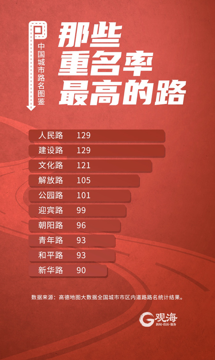 報(bào)告顯示,全國城市內(nèi)道路中重名率最高的是人民路和建設(shè)路,均有129座城市采用。文化路,解放路,公園路,迎賓路,朝陽路,青年路,和平路和新華路分列三到十位。