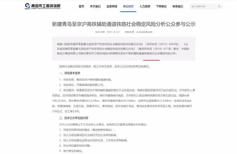 根據(jù)《國(guó)家發(fā)展改革委重大固定資產(chǎn)投資項(xiàng)目社會(huì)穩(wěn)定風(fēng)險(xiǎn)評(píng)估暫行辦法》(發(fā)改投資〔2012〕2492號(hào))、《山東省發(fā)展改革委重大固定資產(chǎn)投資項(xiàng)目社會(huì)穩(wěn)定風(fēng)險(xiǎn)評(píng)估暫行辦法》(魯發(fā)改投資〔2014〕471號(hào))要求,中國(guó)鐵路設(shè)計(jì)集團(tuán)有限公司委托青島市工程咨詢?cè)簩?duì)新建青島至京滬高鐵輔助通道鐵路進(jìn)行社會(huì)穩(wěn)定風(fēng)險(xiǎn)分析。