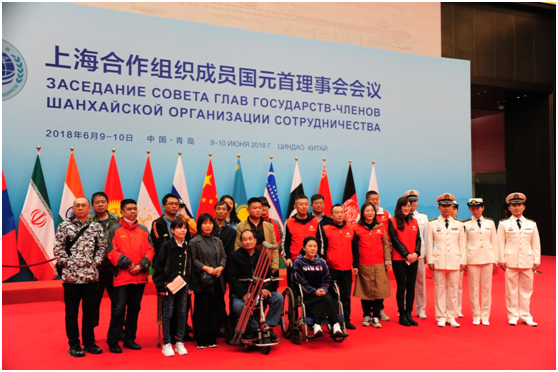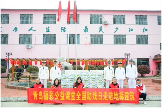 (青島福彩中心志愿者、海軍太湖艦官兵及殘障人士在國際會議中心合影留念)