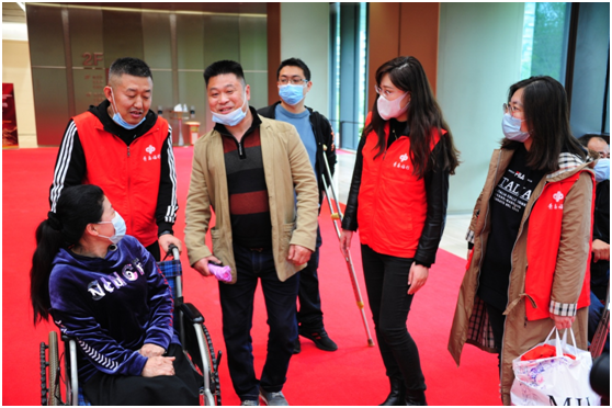 (殘障人士與青島福彩中心志愿者溝通交流)