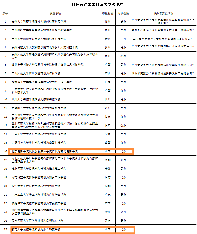 根據(jù)《高等教育法》《普通高等學校設置暫行條例》《普通本科學校設置暫行規(guī)定》和《關于加快推進獨立學院轉(zhuǎn)設工作的實施方案》等法律法規(guī)政策規(guī)定,經(jīng)第七屆全國高等學校設置評議委員會專家考察和評議,并經(jīng)黨組會審議,擬同意貴州大學科技學院等25所獨立學院轉(zhuǎn)設為獨立設置的本科學校,現(xiàn)將學校名單等信息向社會公示。