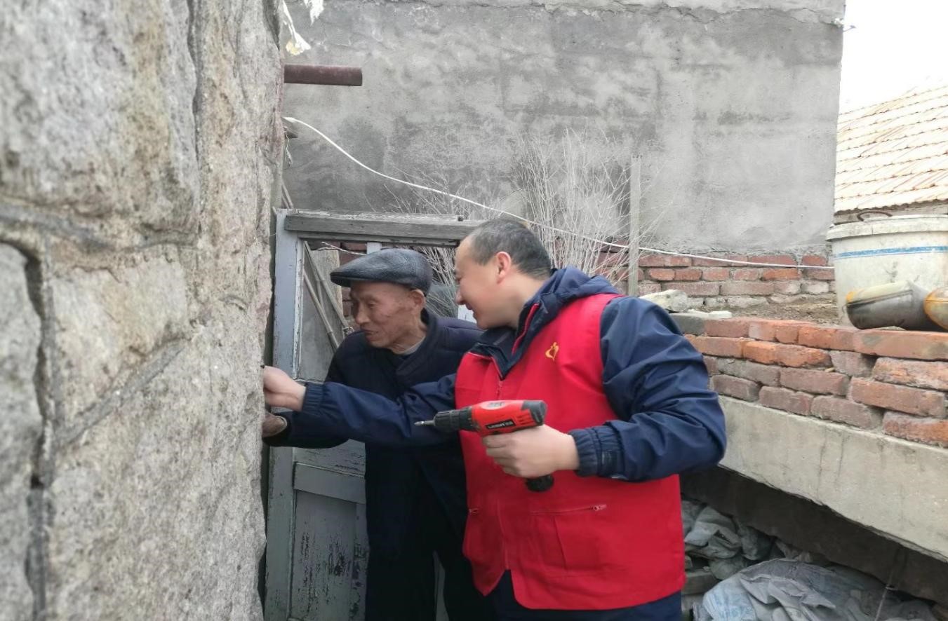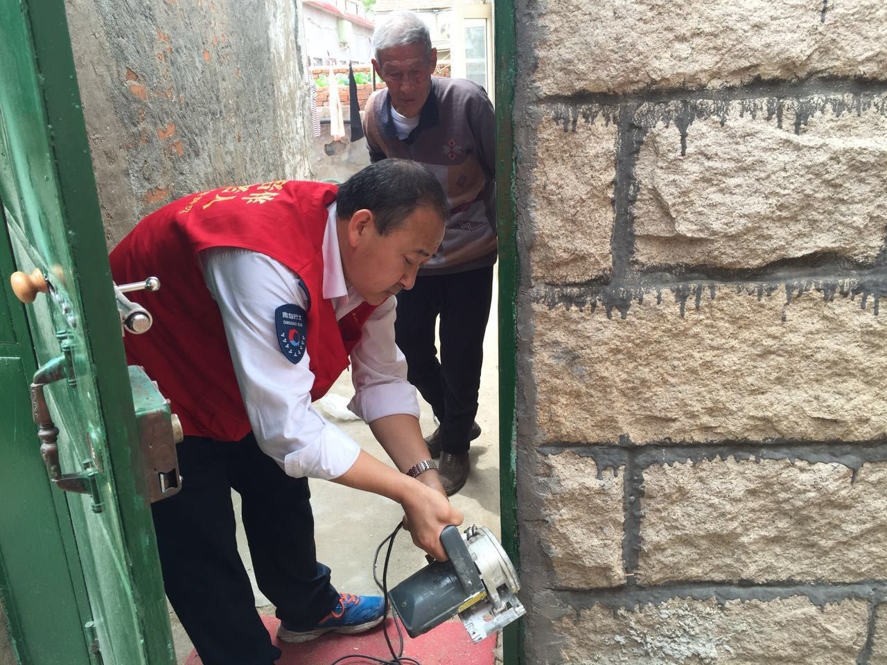 在以后的陪伴中,我就開始細(xì)心的觀察,有時(shí)候與老人的交談中也暗中打探老人有沒有需要的東西,了解情況后我們都會積極努力地去幫老人解決困難。夏天,我們?yōu)槔先嗽鹤永锎钇鹫陉柵?,冬天,為老人院子里的水管加上保溫棉。每一件事情都是?xì)心觀察,用心去做!我們結(jié)對的空巢老人中有位叫曲方平的大爺,性格開朗,非常健談,但是有一件事情困擾著大爺十幾年,曲大爺年屆9旬,聽力不好,曲大爺家有一個(gè)院子,老人獨(dú)居屋內(nèi),院子的鐵門從里面鎖上,有人來敲門,老人聽不見,外面的人就非常著急,所以曲大爺就問我們志愿者有沒有什么好辦法幫他解決這個(gè)難題。我得知大爺?shù)倪@個(gè)心愿后,立即開動腦筋想辦法,經(jīng)過好幾天的苦思冥想,終于確定下了解決方案,我買來插銷,帶上工具,為曲大爺家的鐵門安上了合適的插銷,使鐵門里外都能打開,門打開了,也打開了曲大爺十幾年的心結(jié)。大爺試過以后感覺既美觀又實(shí)用,逢人就夸志愿者真有本事,沒有解決不了的事!