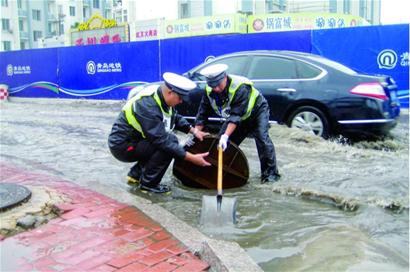 李涌和同事冒雨排水。觀海新聞/青島早報首席記者 孫啟孟 攝