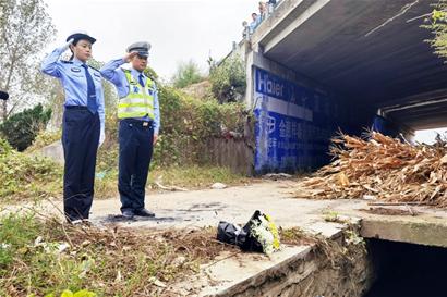 5日,早報(bào)記者趕到事發(fā)地點(diǎn),橋下的水渠旁還殘存著一些血跡,李涌就犧牲在這里。李涌同事和其他趕來(lái)緬懷李涌的人,已經(jīng)在此處放上鮮花和礦泉水。這是一處高速公路下穿的鄉(xiāng)村公路涵洞,從地面到高速公路護(hù)欄有近4米的高度,下面是水泥硬化的路面,旁邊是一處半米寬的水渠。李涌跌落的地方就在水渠和路邊之間。